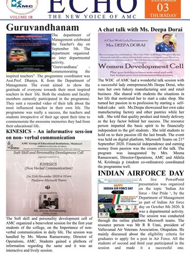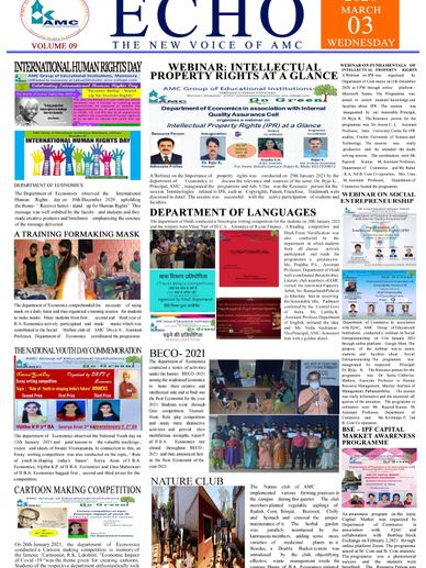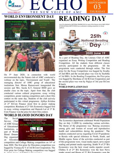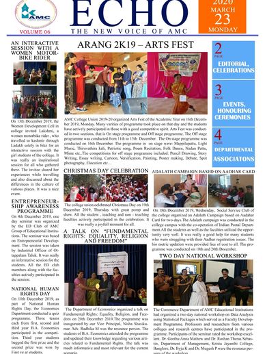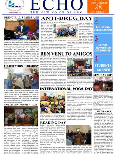 A news letter is published once in every three months named ‘ECHO’ compiling the various academic, non-academic and creative activities carried out by the clubs, cells, departments and students of the college. This is a replica of the well-knit coordination of the management, students and teaching staffs in ensuring the successful functioning of curricular and extra-curricular activities objectifying the physical and mental growth of students.